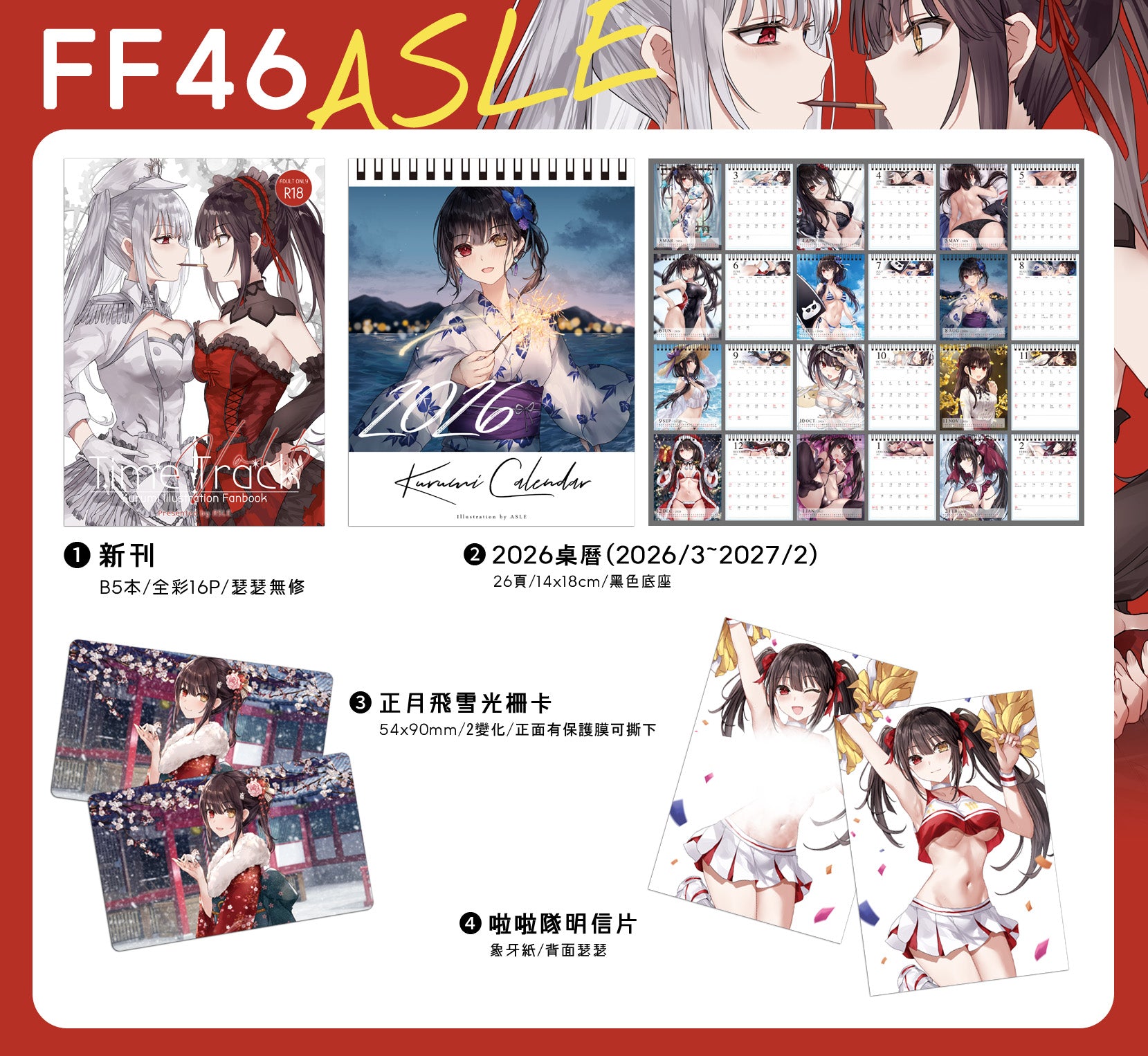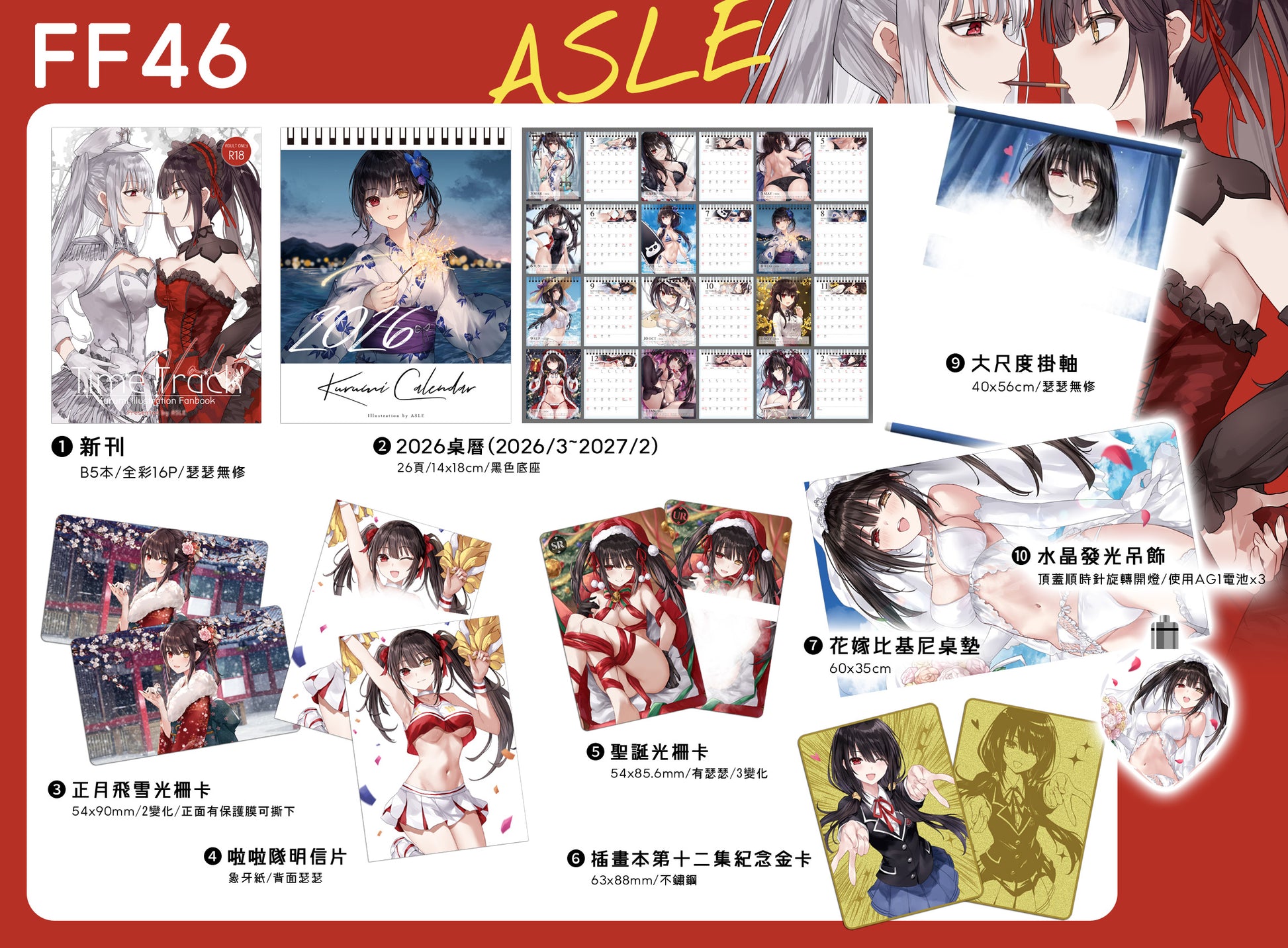【大套組內容物】1.新刊《Time Track Vol.6》:B5本/全彩16P/瑟瑟無修2.2026桌曆(2026/3~2027/2):26頁/14x18cm/黑色底座3.正月飛雪光柵卡:54x90mm/2變化/正面有保護膜可撕下4.啦啦隊明信片:象牙紙/背面瑟瑟5.聖誕光柵卡:54x85.6mm/有瑟瑟/3變化6.插畫本第十二集紀念金卡:63x88mm/不鏽鋼7.花嫁比基尼桌墊:60x35cm9.大尺度掛軸:40x56cm/瑟瑟無修10.水晶發光吊飾:頂蓋順時針旋轉開燈,逆時針關燈/卸下換電池/使用AG1電池x3