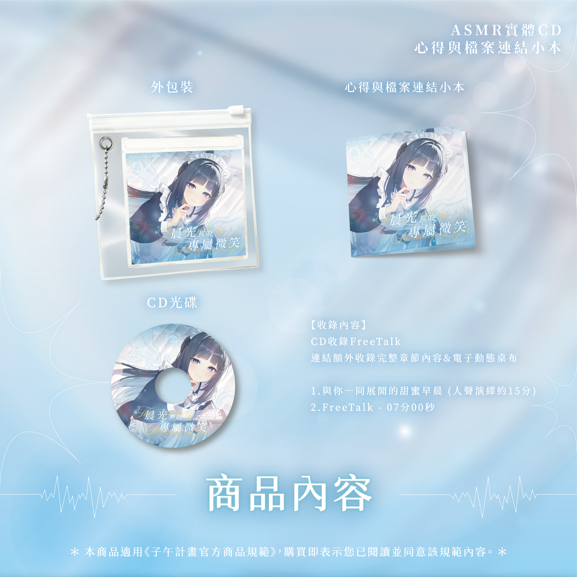 ##ASMR內容:◆ 《晨光裡的專屬微笑》祈Iruni 女僕系列ASMR-CD【尺寸】外盒約9x9.3cm / 心得與檔案連結小本8.5x8cm (含雲端數位檔案)【小本】雪銅 / 全彩印刷 / 4p【簡介】CD收錄Freetalk / 連結額外收錄電子動態桌布&完整章節1.與你一同展開的甜蜜早晨2.FreeTalk