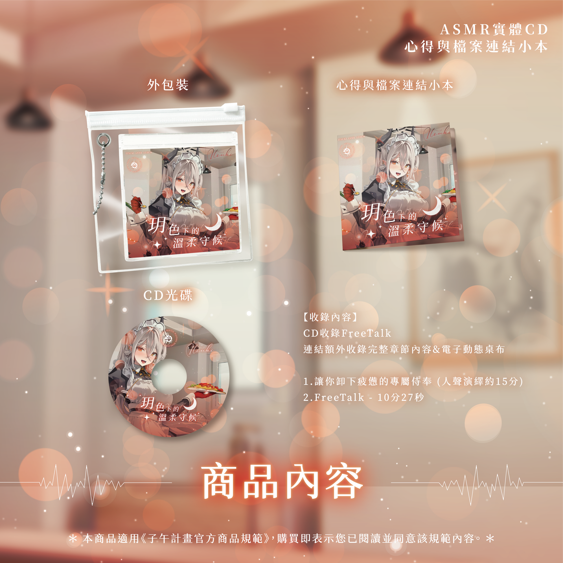 ◆ 《玥色下的溫柔守候》玥Itsuki 女僕系列ASMR-CD【尺寸】外盒約9x9.3cm / 心得與檔案連結小本8.5x8cm (含雲端數位檔案)【小本】雪銅 / 全彩印刷 / 4p【簡介】CD收錄Freetalk / 連結額外收錄電子動態桌布&完整章節1.讓你卸下疲憊的專屬侍奉2.FreeTalk