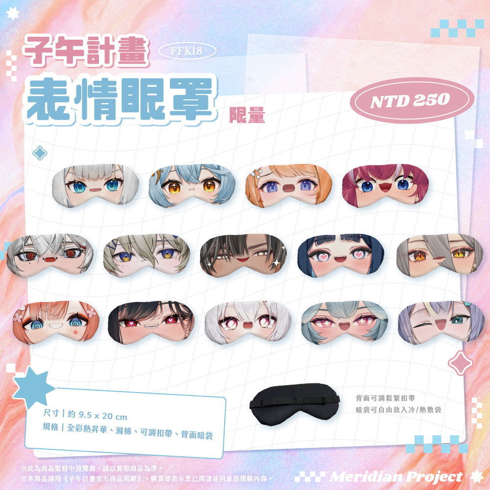 ◆ 《子午》表情眼罩(限量)【尺寸】約 9x20cm【規格】全彩熱昇華、滌棉、可調扣帶、背面暗袋【款式】浠Mizuki / 澪Rei / 橙Yuzumi / 煌Kirali / 朔Sakuro / 朧Oboro / 宵Yoruno / 祈Iruni / 玥Itsuki / 玖玖巴 / 幸Sachi / 雪Koyuki / 煦Hiyori / 実Hitomi