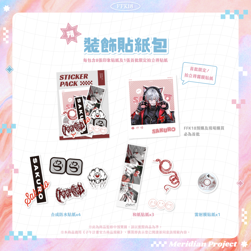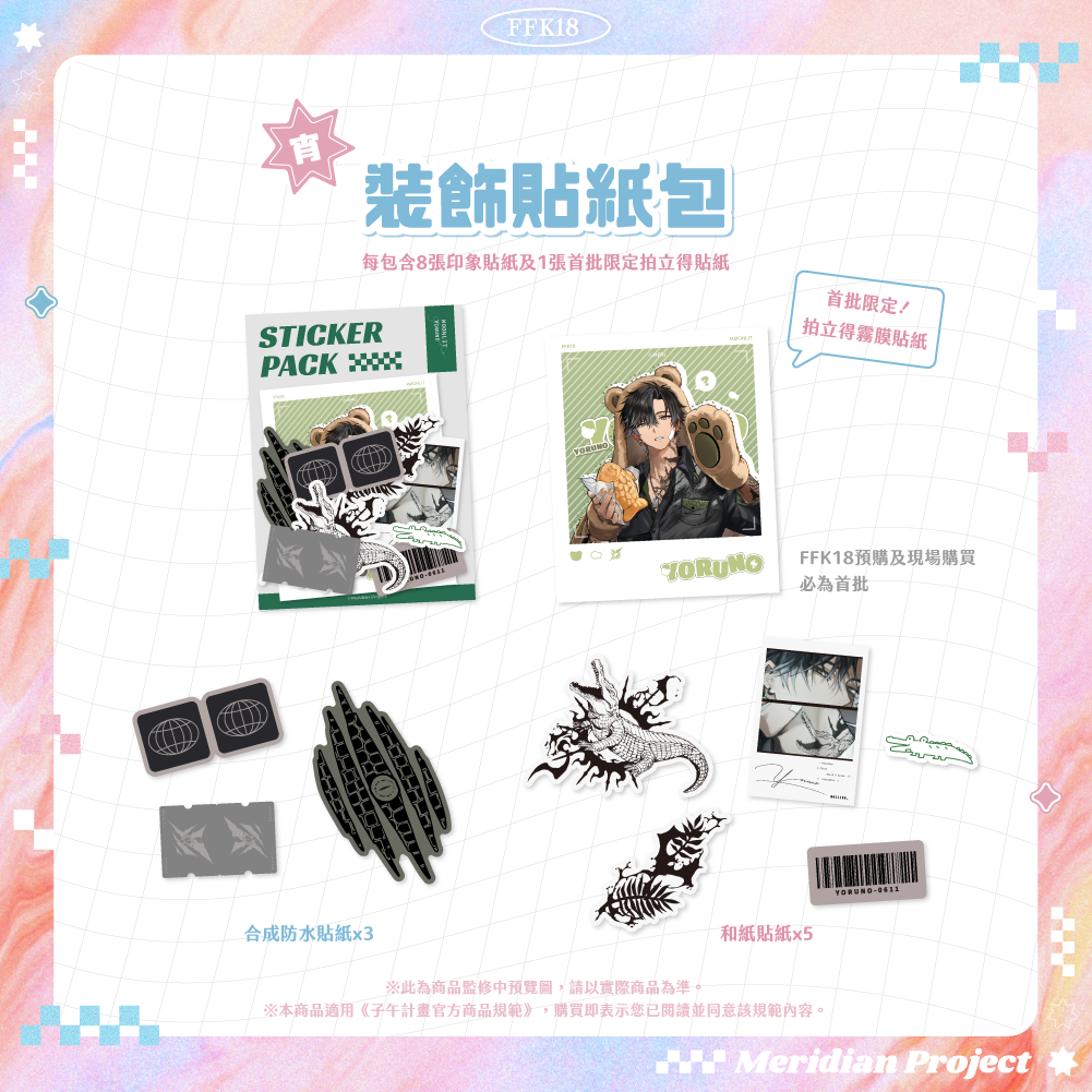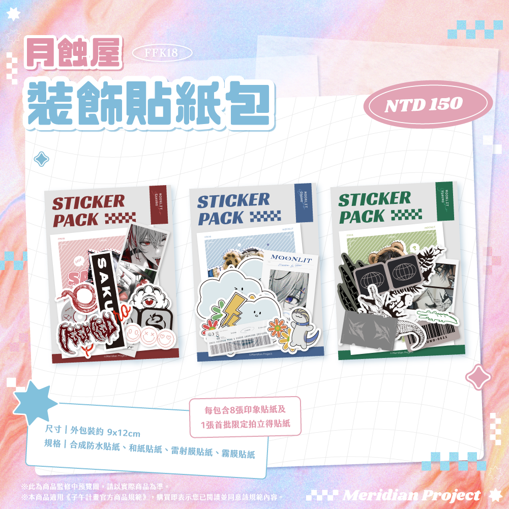 ◆ 《月蝕屋》裝飾貼紙包【尺寸】外包裝約 9x12cm【規格】合成防水貼紙、和紙貼紙、雷射膜貼紙、霧膜貼紙【款式】朔Sakuro / 朧Oboro / 宵Yoruno※FFK18預購賣場及FFK18現場購買必為首批貼紙包,皆含首批限定拍立得貼紙※